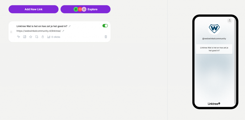 Hieronder zie je een voorbeeld van een link naar deze pagina in linktree.