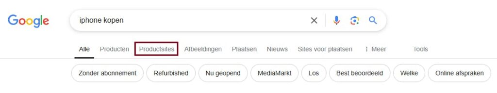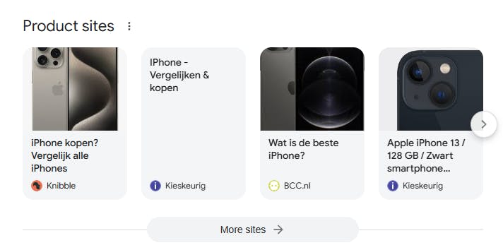 Bij een zoekopdracht naar “iphone kopen” genereert Google bijvoorbeeld een “Product sites” sectie die deels op gestructureerde data (en deels op Shopping feeds) is gebaseerd.