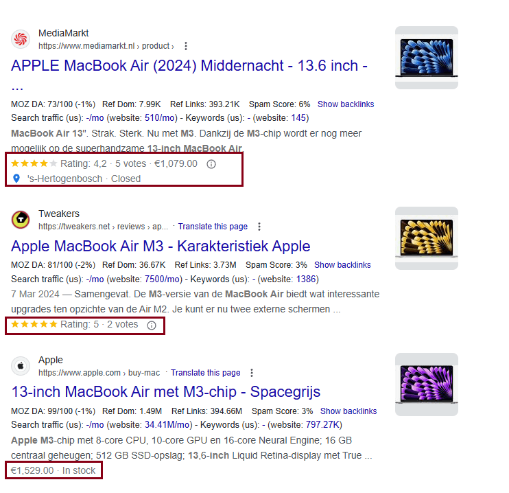 Bij een zoekopdracht naar “apple macbook air m3” toont de gestructureerde data van MediaMarkt bijvoorbeeld betaalbare prijsopties, terwijl Apple gedetailleerde voorraadinformatie weergeeft.